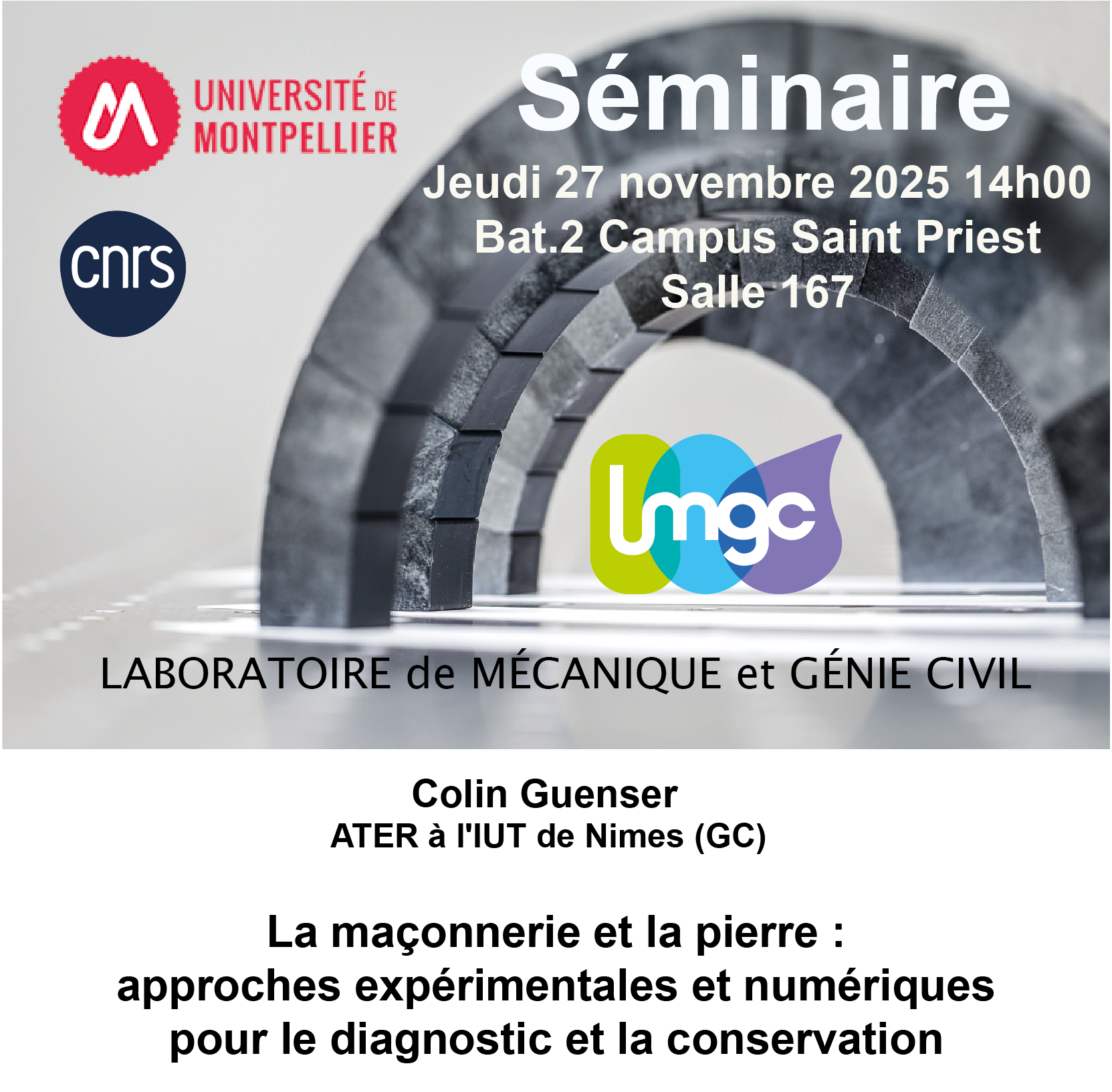 UMR CNRS / Université de MontpellierLe Laboratoire de Mécanique et Génie Civil (LMGC) est une Unité Mixte de Recherche du CNRS et de l’Université de Montpellier depuis 1991. Le LMGC compte 130 personnes, dont les activités s’articulent autour de trois axes de recherche : imagerie et champs en mécanique, interactions mécaniques et couplages multiphysiques et mécanique du vivant.